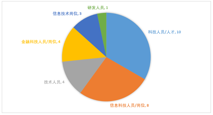 在30家披露了科技崗位的具體人員數(shù)據(jù)情況中,各家銀行對(duì)于科技崗位的命名均有所差異。零壹智庫對(duì)類似的名稱做了統(tǒng)一,如瀘州銀行使用的“科技人才”、渝農(nóng)商行使用的“全職科技人才”統(tǒng)一歸類為“科技人員/人才”。經(jīng)統(tǒng)計(jì),使用最多的是“科技人員/人才”這一名稱,共有10家銀行使用,幾乎都為股份制商業(yè)銀行或者城商行。而國有銀行中有三家使用的是“金融科技人員”這一名稱,分別為交通銀行、工商銀行和建設(shè)銀行。而“研發(fā)人員”這一崗位名稱僅有招商銀行使用。下圖顯示了具體分布情況: