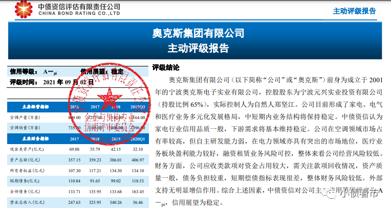 9月2日,中債資信給予奧克斯集團有限公司(以下簡稱“奧克斯集團”)主體評級為A-,評級展望“穩(wěn)定”。