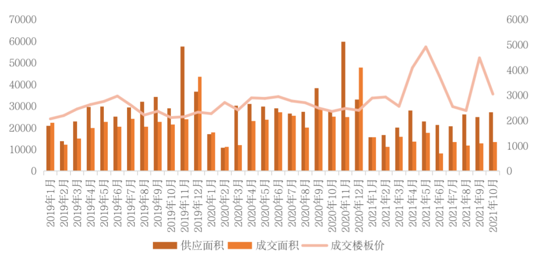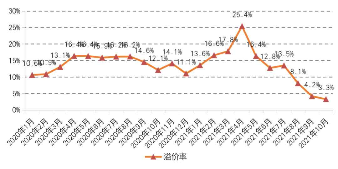 在此影響下,2021年10月成交溢價率較上月進一步走低,環比減少0.9個百分點,降至3.3%,再創下2020年以來的最低值。