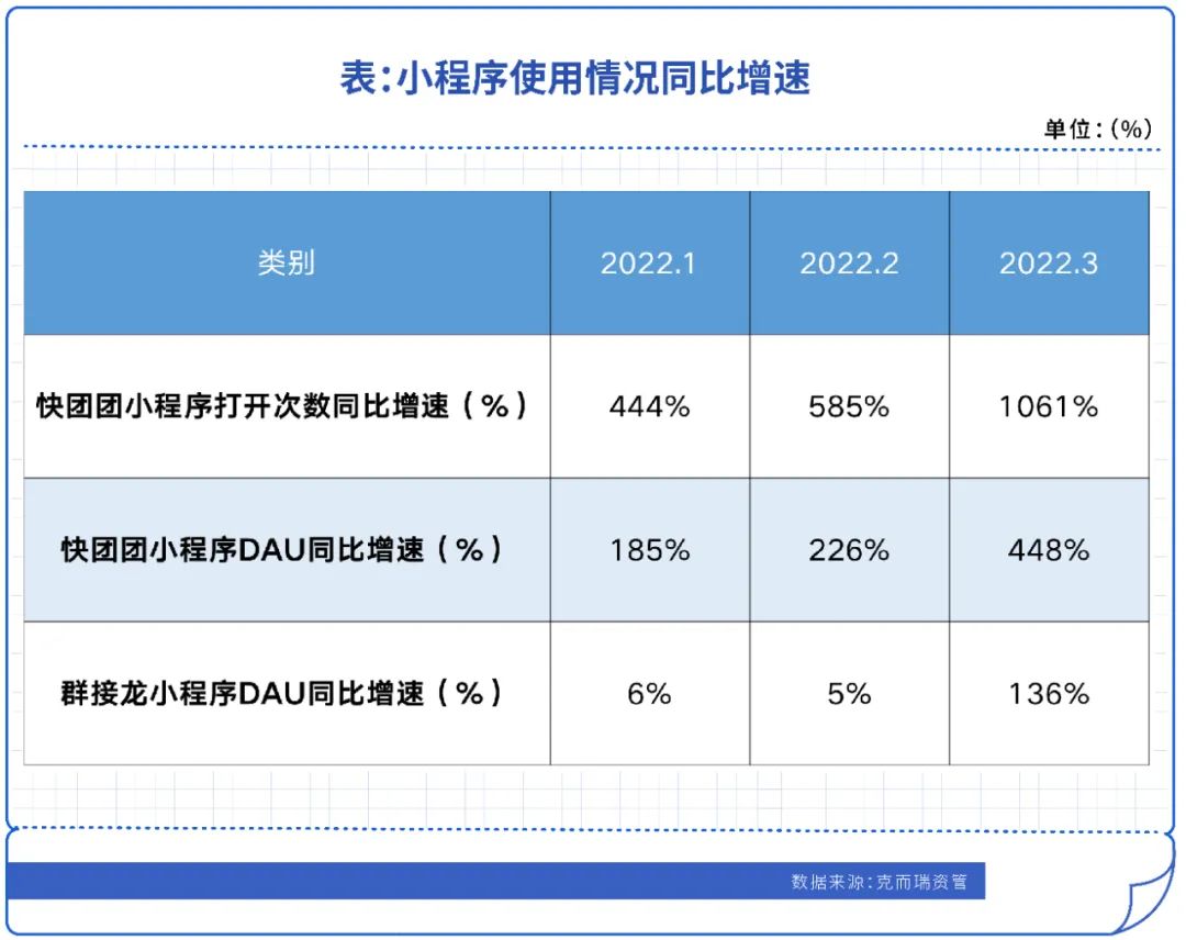 CAIC數據顯示,快團團小程序打開次數同比增速在2022年3月達到1061%高位,DAU同比增速也有448%的大幅增長,主要是受社區團購影響。