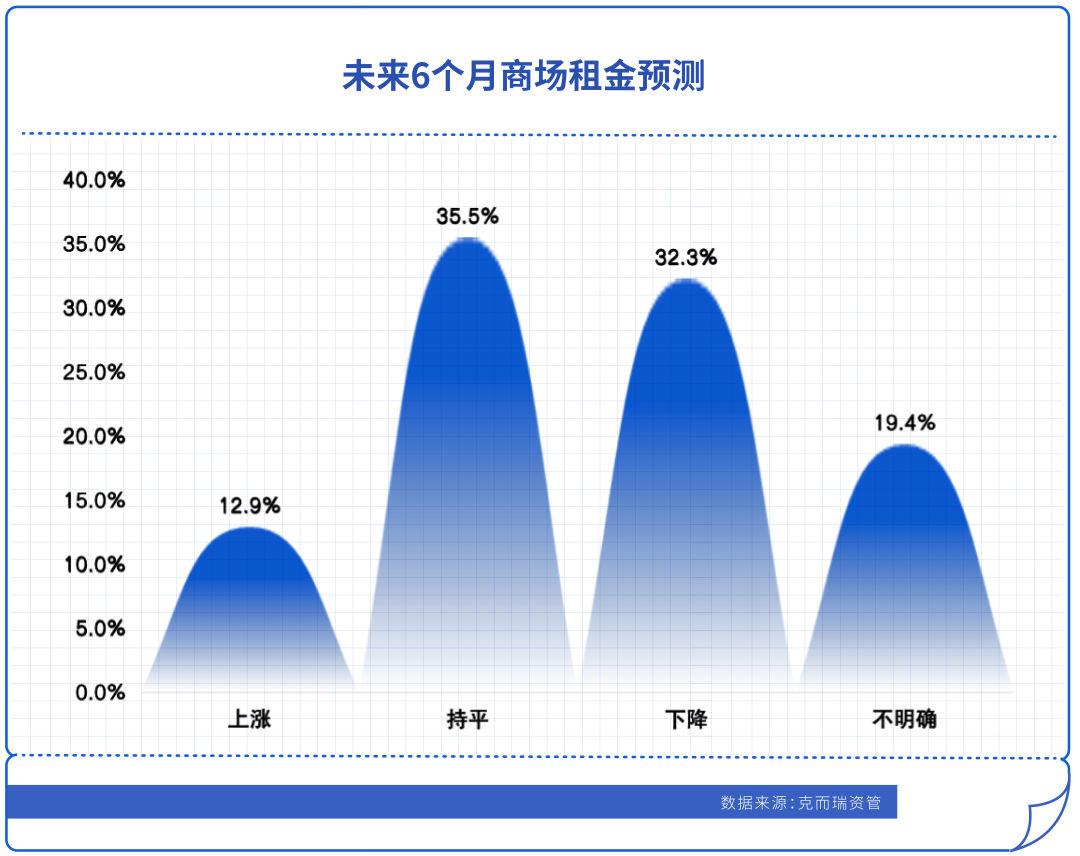 關于未來6個月的租金走勢,克而瑞資管對北上廣深典型商場運營人員的抽樣調研顯示,僅12.9%持上漲態度,持平及下跌占比達35.5%和32.3%,對后市的預期較為悲觀。