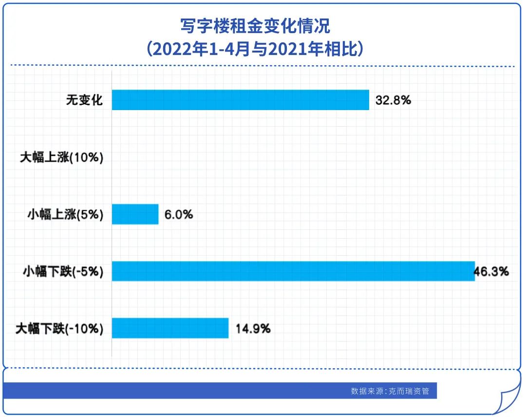 今年1-4月與2021年同期相比,61.2%的寫字樓租金出現下跌,其中14.9%大幅下跌。在對未來的預期中,僅10.5%的被調研物業運營者認為未來6個月寫字樓租金上漲。
