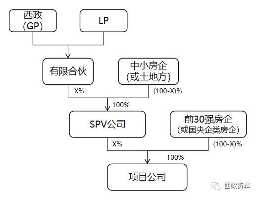 為了有效控制風險,我們目前操作的針對小股東融資的產品一般會要求合作各方先滿足一些基本的要求,比如小股東(或中小房企)的交易對手需為前30強房企或國央企類房企,合作拿地或合作開發項目由上述前30強房企或國央企類房企占大股、并表,或由國央企負責操盤或主導項目的開發建設。在土地競拍階段,小股東持股部分的土地前融由我們來處理,上述前30強房企或國央企類房企能支付土地競拍保證金的大頭則更好。以我們下述融資架構為例,我們給小股東的融資不需要其交易對手(前30強或國央企類房企)提供背書,融資成本可以媲美我們直接向百強房企提供前融的成本(目前在年化10%-12%左右,具體看項目優質程度有所浮動),但這種融資產品非常依賴于小股東的交易對手(大房企或國央企)的操盤能力,因此投后管理成為了我們關注的重點。