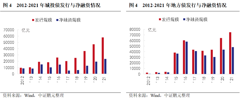 具體看2021年的重要政策和市場表現:第一,再融資債券發行放量,城投債提前到期兌付。2021年地方再融資債發行規模合計為3.12萬億元,較2020年的發行規模(1.89萬億元)明顯增多。不完全統計,2021年涉及到募集資金用途變為“償還政府存量債務”的再融資債8,170億元,其中,北京、廣東和重慶分別為1,921億元、1,121億元和500億元,位列前三。受此影響,2021年城投債提前兌付情形增加。第二,城投發債門檻上升。2021年初交易所和交易商協會相繼對城投債發行進行分類管理,根據財政部對地方政府債務風險劃分的等級,對于紅色檔暫停發放批文、黃色檔只能借新還舊、綠色檔用途不受限制。2021年6月閃現的銀保監會15號文,進一步明確了當前隱性債務化解的主旋律。第三,重提財政重整和城投破產重整/清算。2021年4月,國務院公布的《關于進一步深化預算管理制度改革的意見》中,提出“清理規范地方融資平臺公司,剝離其政府融資職能,對失去清償能力的要依法實施破產重整或清算”, 12月鶴崗市政府公告實施財政重整計劃。財政重整和城投破產重整/清算均非首次提出,在2021年重提,體現了化解存量債務風險的決心以及化解難度較大。第四,多地成立信保基金,推動國企改革,加強債務風險分類管理。2021年來,天津、廣西、河南等地陸續成立省級信保基金,蘭州、濰坊等地成立市級信保基金,用于國有企業債務風險化解。2021年包括城投公司在內的國有企業改革進程加快,明確央企債務不違約,建立地方政府債務風險管理機制,清理高息債務,調整債務結構。例如,8月河南省發布《關于加強省管企業債務風險管控工作的實施意見》明確,對納入債務風險重點管控名單的企業,要嚴格審核發行方案,并實施債券發行比例限制,原則上債券余額占帶息負債的比例不得超過30%, 一年內到期債券不超過債券余額的60%。當月福建省發布《關于加強所出資企業債務風險管控工作的實施意見》指出,要健全完善債務風險監測預警機制、建立債務風險量化評估機制、建立債務總規模動態管控機制,將債務風險突出的下屬企業納入重點管控范圍(高于本行業上年度規模以上全部企業平均資產負債率加5個百分點)。