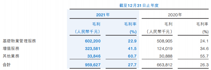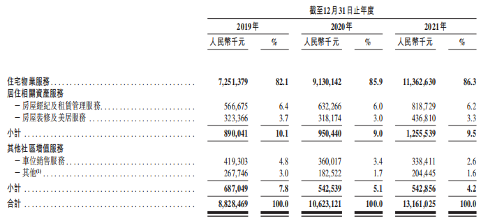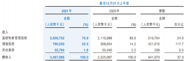 收入主要來源三個業(yè)務(wù):基礎(chǔ)物業(yè)管理服務(wù)、增值服務(wù)以及其他業(yè)務(wù)。