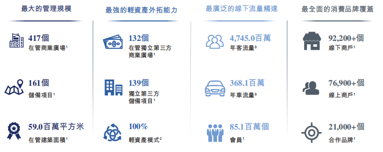 集團(tuán)擁有的品牌體系,主要包括城市型購物中心「COCO Park」(以城市消費者為目標(biāo))、區(qū)域型購物中心「COCO City」及「iCO」(以購物中心五公里范圍內(nèi)的消費者為目標(biāo))、社區(qū)型購物中心「COCO Garden」(以購物中心一至三公里范圍內(nèi)的消費者為目標(biāo))及其高檔家居布置購物中心「第三空間」。