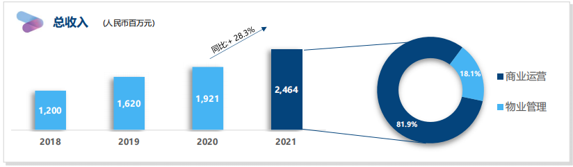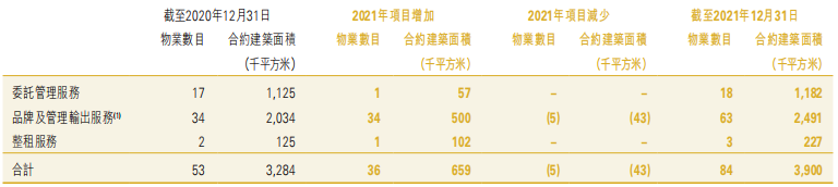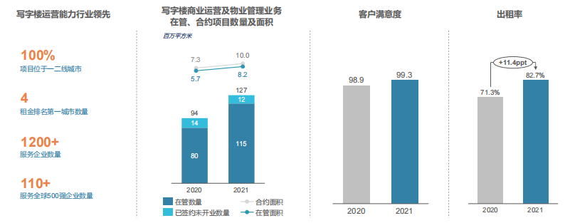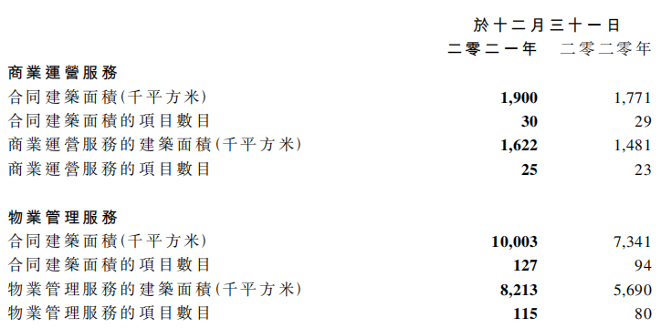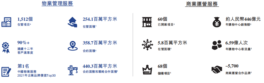截至2021年底,集團(tuán)住宅及其他物業(yè)管理業(yè)務(wù)覆蓋全國100個城市,合約面積1.859億平方米,在管面積1.468億平方米。提供商業(yè)運營服務(wù)的已開業(yè)購物中心數(shù)量為71個,已開業(yè)寫字樓數(shù)量為25個。