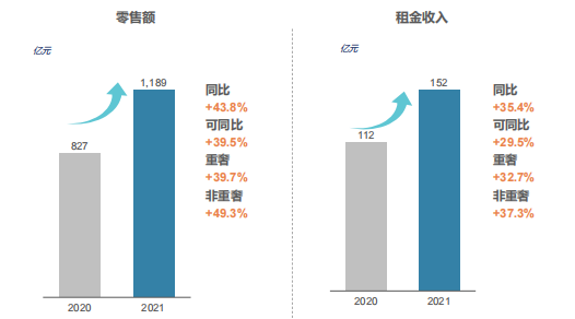 報告期間內(nèi),集團(tuán)出租率維持在94%的健康水平,合作商戶數(shù)量超4300家,同店銷售額較2020年同期增長約21%。