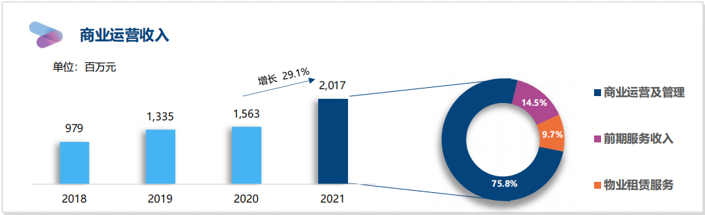 商管業(yè)務(wù)方面,公司商業(yè)運營業(yè)務(wù)仍占據(jù)核心地位,營收貢獻(xiàn)比達(dá)81.9%,2021年實現(xiàn)收入20.17億元,同比增加29.1%。商業(yè)運營服務(wù)業(yè)務(wù)實現(xiàn)毛利約7.11億元。
