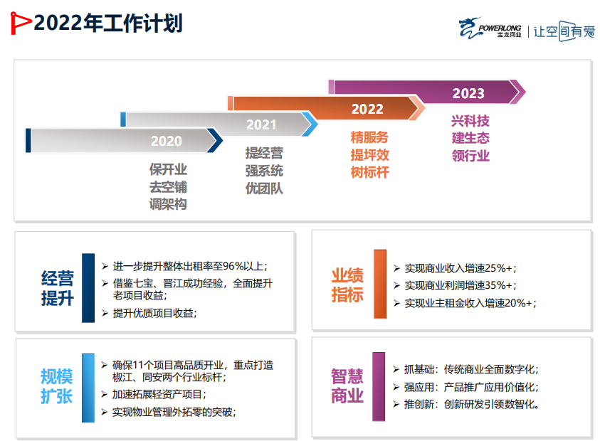 2022年,集團(tuán)將進(jìn)一步提升整體出租率至96%以上。確保11個項目開業(yè),其中購物中心不少于8個。并實現(xiàn)商業(yè)收入增速25%以上。