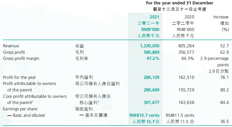 毛利約為人民幣3.304億元,同比增長約32.9%。毛利率為57.7%。年內(nèi)應(yīng)占利潤約為人民幣1.849億元,同比增加約45.8%。