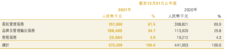 報告期間內(nèi),集團(tuán)的收入約為人民幣5.722億元,同比增長約29.5%。其中,來自委托管理服務(wù)的收入約為人民幣351.7百萬元,同比增長約13.9%,占總收入約61.5%;來自品牌及管理輸出服務(wù)的收入約為人民幣198.5百萬元,同比增長約74.2%,占總收入約34.7%;來自整租服務(wù)的收入約為人民幣22.1百萬元,同比增長約14.8%,占總收入約3.8%。