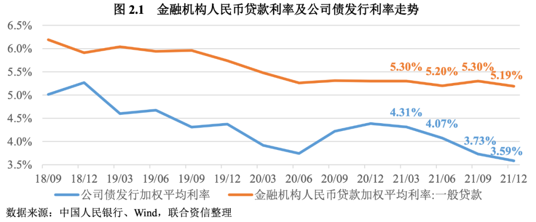 2021年,貨幣供給靈活適度,貸款利率穩(wěn)中有降,公司債發(fā)行利率前高后低,企業(yè)綜合融資成本穩(wěn)中有降。2021年,穩(wěn)健的貨幣政策靈活精準(zhǔn)、合理適度,央行綜合運(yùn)用降準(zhǔn)、公開市場操作、中期借貸便利等工具,保持流動性合理充裕。綜合運(yùn)用多種貨幣政策工具投放流動性。2021年7月和12月兩次降準(zhǔn)各0.5個百分點(diǎn),共釋放長期資金2.2萬億元,疊加多種結(jié)構(gòu)性貨幣政策,促進(jìn)銀行資金成本下降。企業(yè)綜合融資成本穩(wěn)中有降。2021年,LPR基本維持穩(wěn)定,人民幣一般貸款加權(quán)平均利率有所波動,12月1年期LPR下行5個基點(diǎn)至3.8%,打破19個月連續(xù)持平的局面,引導(dǎo)下一階段實(shí)體經(jīng)濟(jì)貸款利率下行。二季度起,流動性寬松預(yù)期加強(qiáng),疊加地方政府債發(fā)行滯后、局部信用收縮等原因?qū)е碌臋C(jī)構(gòu)欠配壓力增加,公司債發(fā)行加權(quán)平均利率持續(xù)下降,推動企業(yè)部門綜合融資成本穩(wěn)中有降。