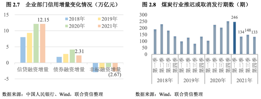 2021年,企業(yè)部門信貸融資、債券融資持續(xù)增長,非標(biāo)融資存量壓降。企業(yè)信貸融資體現(xiàn)“穩(wěn)”字,力度較上年相當(dāng),仍舊較強(qiáng)。從增速看,2021年企業(yè)信貸融資余額122.68萬億元,同比增長10.99%,增速較上年持平且全年增速保持平穩(wěn)。從增量看,2021年信貸融資增量12.15萬億元,較2020年疫情高發(fā)期間維持相當(dāng)水平,全年保持了較強(qiáng)的信貸力度。企業(yè)債券融資受“永煤事件”影響,一季度增速大幅下降,隨后企穩(wěn)。2021年末,企業(yè)債券融資余額29.93萬億元,同比增長8.36%,一季度企業(yè)債券融資增速大幅下降,主要系2020年的“永煤事件”引發(fā)債券市場對地方國有企業(yè)信用風(fēng)險的擔(dān)憂,投資人對煤炭行業(yè)及部分地區(qū)發(fā)行的債券采取一刀切措施,債券取消或延遲發(fā)行期數(shù)較多(見圖8),擔(dān)憂情緒延續(xù)至2021年一季度,使得企業(yè)債券融資增速大幅下滑。二季度以來,隨著監(jiān)管機(jī)構(gòu)對債市逃廢債行為的嚴(yán)厲處罰,以及煤炭行業(yè)經(jīng)營層面景氣度持續(xù)升溫[2],債券市場投資人信心逐步修復(fù)。企業(yè)非標(biāo)融資壓降力度明顯提升,未來壓減空間有限。2021年末,企業(yè)非標(biāo)融資余額18.24萬億元,同比下降12.77%,2021年以來監(jiān)管部門加大對表內(nèi)外風(fēng)險資產(chǎn)處置,信托融資類業(yè)務(wù)在2020年壓降計(jì)劃基礎(chǔ)上再降20%,非標(biāo)融資壓降力度顯著提升。2021年是資管新規(guī)過渡期延長期限的最后一年,預(yù)期2022年非標(biāo)融資仍會規(guī)范化管理,但預(yù)期壓降力度較2021年有限。