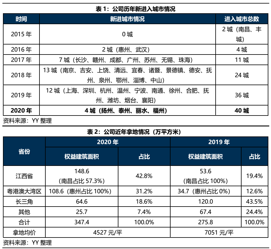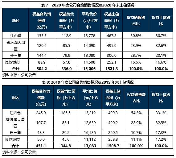 這一戰(zhàn)略布局在公司經(jīng)營中體現(xiàn)較為明顯。公司一改2018-2019年度對外攻城略地的表現(xiàn),2020年新進入城市僅4座;公司2020年度拿地情況較上年變化明顯,整體看,對江西省下沉更加顯著,江西省內(nèi)南昌以外地區(qū)占比增加,而對粵港澳、其他地區(qū)風險偏好較低,主要集中于較早進入深耕的惠州以及其他省會城市,江西省、長三角、粵港澳以外的地區(qū)占比下降明顯。從拿地均價上看,2020年拿地整體相比2019年較為下沉。