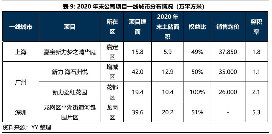 聚焦二三線,同時下沉部分四線。按城市能級看,公司進入的一線城市僅有廣州(23.3萬平方米,占比1.5%)、深圳(20.2萬平方米,占比1.3%)和上海(5.9萬平方米,占比0.4%),各自僅有1-2個項目,且全部位于非中心城區(qū)。考慮到2020年度公司在一線城市并無新增拿地,公司可能尚無深入一線城市的打算,一線城市項目用來提高知名度的意義更大。