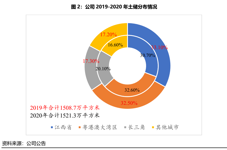 從土儲分布看,截至2020年末,公司權益口徑土儲規(guī)模達1,521.3萬平方米,公司主要經(jīng)營的江西省、粵港澳大灣區(qū)、長三角、其他城市的權益口徑土儲分布較為均勻,2019-2020年比例變化不大。