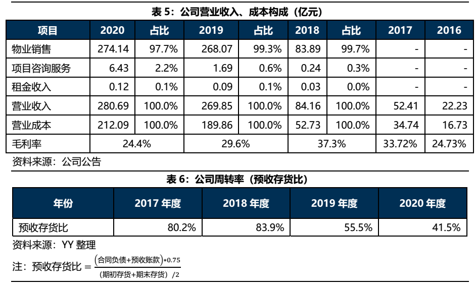 公司營業(yè)收入主要包括物業(yè)銷售、項目咨詢服務以及租金收入,2020年度物業(yè)銷售收入占營收比重達97.7%,是公司最主要的收入來源。可以看到2016年以來公司營收規(guī)模不斷擴大,但2020年增速下降明顯,同時2018年以來毛利率水平與周轉(zhuǎn)率持續(xù)下降。