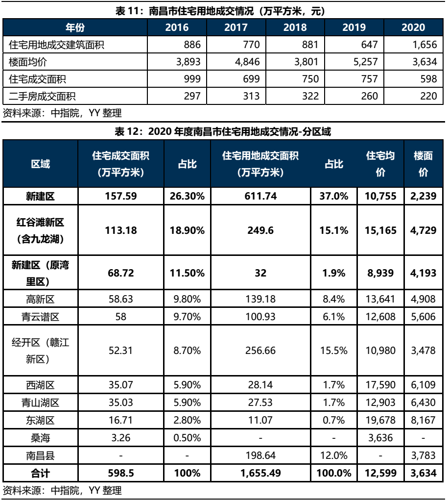 從住宅用地、商品房成交情況上看,2020年度南昌市住宅用地成交建面達1,656萬平方米,同比增長156%,樓面均價以及商品住宅成交面積有所下降,二手房成交也較為低迷。值得注意的是2020年度住宅用地、商品房的成交主要分布在南昌市新城區(qū)新建區(qū)、紅谷灘新區(qū)和外圍地區(qū)的南昌縣等,以東湖區(qū)、西湖區(qū)、青山湖區(qū)、青云譜區(qū)為主的老城區(qū)分布較少。