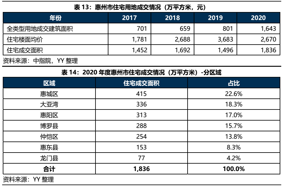 從住宅用地、商品房成交情況上看,2020年惠州市全類型土地成交面積達1,643萬平方米,同比增長105%,相對應的住宅成交面積達1,836萬平方米,2017-2020年惠州市場整體處于去庫存的狀態(tài)。其中作為主城區(qū)的惠城區(qū),以及毗鄰深圳的大亞灣和惠陽區(qū)住宅成交面積排名靠前。