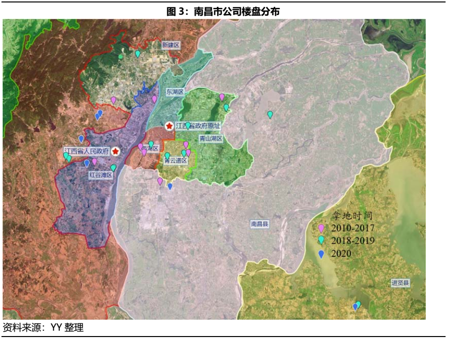 而從樓盤分布情況上看,公司的項目分布整體處于贛江兩岸,且也在向西發(fā)展。截至2020年末,公司項目主要分布在中心城區(qū)以及中心城區(qū)外圍地區(qū),其中老城區(qū)的項目拿地時間均在2020年之前,公司2020年拿地主要集中在新城區(qū),為新建區(qū)與紅谷灘區(qū)交界一帶,南昌市遠郊的進賢縣也有零星的項目。
