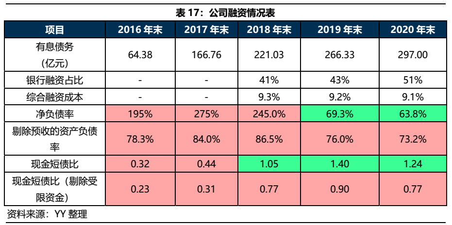 公司整體杠桿水平較高。截至2020年末,公司有息債務規(guī)模達297億元。按債務期限看,其中短期有息債務占比47.5%,短期有一定償債壓力;按債務結構看,非標融資占比達26%,比例非常高。公司近年來銀行融資比例雖有所提高,但2020年綜合融資成本為9.1%,近年來一直處于較高水平,高杠桿高成本,很容易放大風險。
