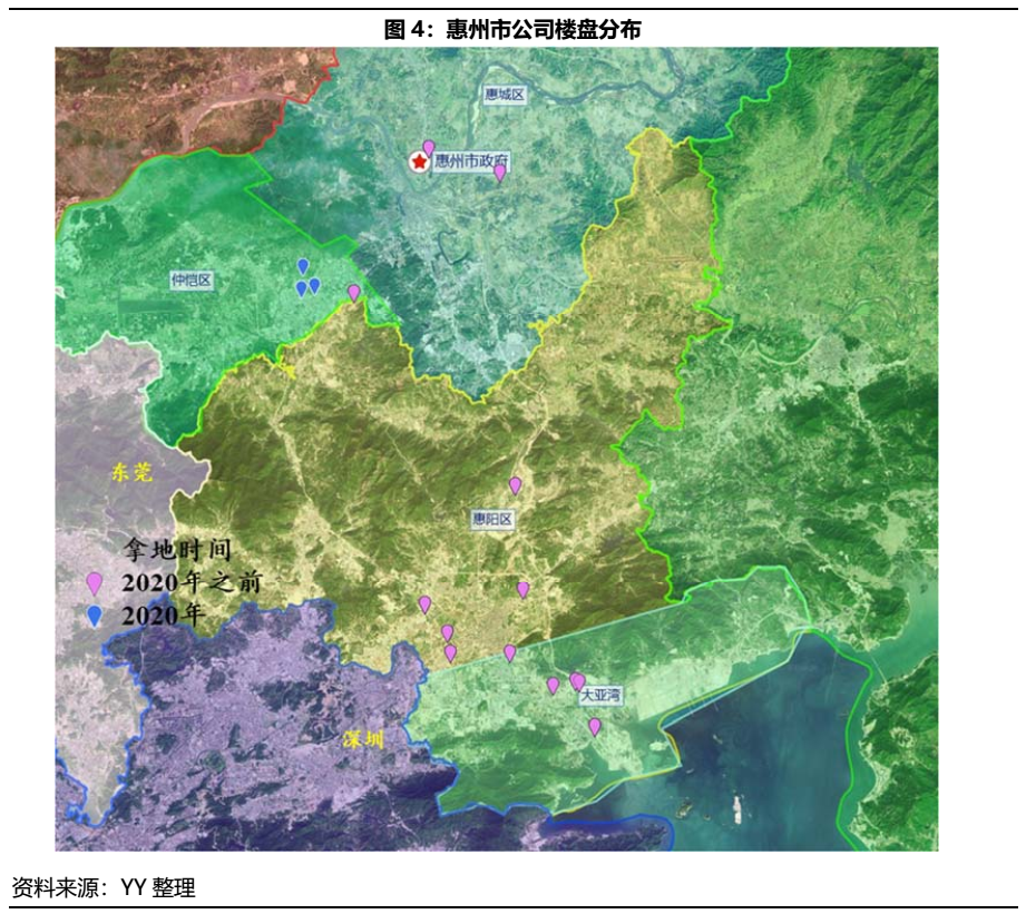 從空間上看,公司在惠州的項目主要分布在承接深圳外溢剛需的臨深片區(qū),小部分在承接產(chǎn)業(yè)支撐的仲愷區(qū)以及主城區(qū)惠城區(qū)。從時間上看,2019年之前公司十分熱衷于在鄰近深圳的區(qū)域拿地,2019年公司未在惠州拿地,而2020年公司轉(zhuǎn)了個大彎,拿地均在仲愷區(qū),且位置較為集中,相互之間距離較為接近。仲愷區(qū)是惠州的產(chǎn)業(yè)園區(qū),入駐企業(yè)較多,距離深圳較遠,公司應是看中了這里的產(chǎn)業(yè)支撐。然而公司在仲愷區(qū)的地塊過于集中,且總建筑面積達120萬平方米,后續(xù)去化可能存在一定壓力。