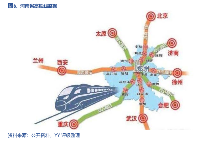 除了密集交錯的鐵路、公路線外,地處內陸的河南為了走出去,2013年建立了鄭州航空港經濟綜合實驗區,開始了問天要路的發展之旅。航空港區內的新鄭機場作為中國八大區域性樞紐機場之一,借助于港區強大的手機終端生產能力,在貨郵吞吐量中排名全國第七;同時2.5小時的航空圈可覆蓋全國人口的90%,旅客吞吐量排名全國十二,航空樞紐地位顯著。另外除了新鄭,省內還有其他5個機場分別位于洛陽、南陽、商丘、信陽,完善補充了全省的航空體系。