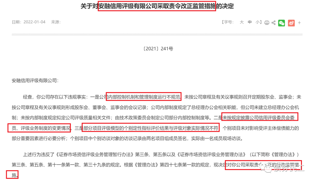 根據北京證監局2022年1月4日的公開信息,安融信用評級有限公司(以下簡稱“安融評級”)因為內部控制機制和管理制度運行不規范、未按規定披露公司信用評級委員會委員及評級業務制度的變更情況、部分項目評級模型的個別定性指標評價結果與評級對象實際情況不符等原因,被證監局采取責令改正監管措施,成為2021年最后一家被監管機構采取監管措施的評級機構。