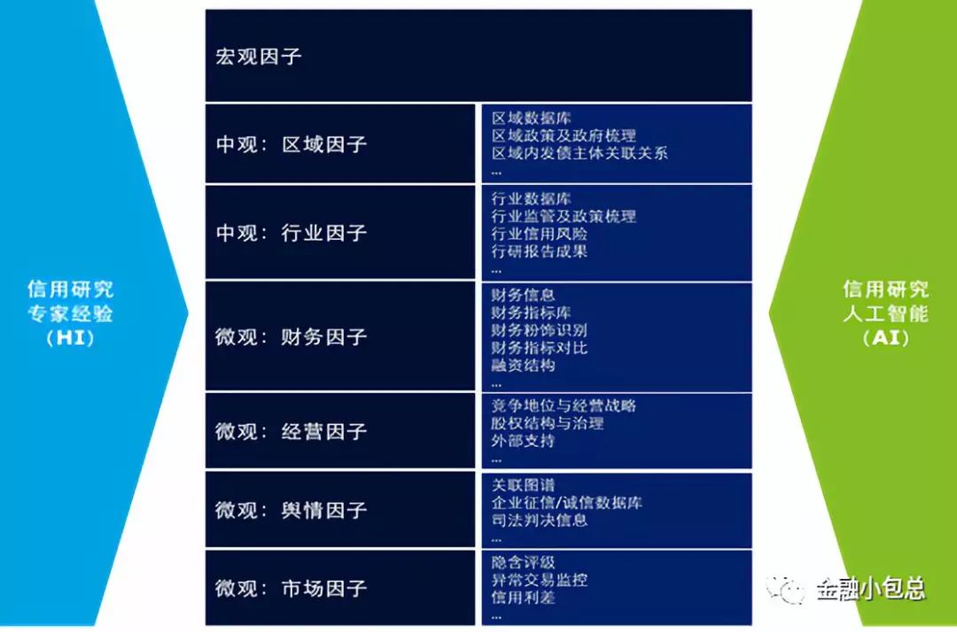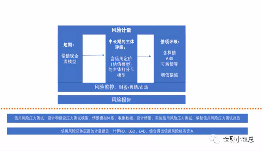 內(nèi)評體系化建設(shè)的核心落腳點在于提升團隊的風(fēng)險識別、風(fēng)險計量、風(fēng)險緩釋及處置能力。風(fēng)險識別是信用風(fēng)險評估入口的問題,風(fēng)險計量是信用風(fēng)險評估出口的問題。信用風(fēng)險的評估環(huán)節(jié)入口應(yīng)綜合專家經(jīng)驗和人工智能兩套方法論,而信用評估的出口環(huán)節(jié)精細化信用研究成果如下圖所示: