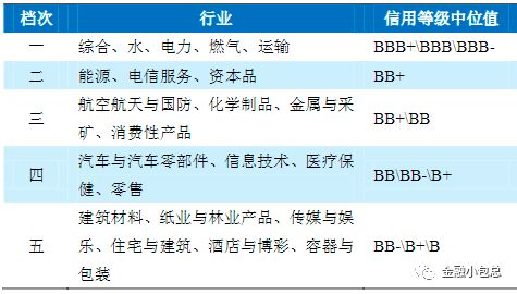 宏觀和行業(yè)維度看,大致可以分為三塊工作。第一是充分借鑒賣方行業(yè)研究的成果。第二是針對行業(yè)信用風(fēng)險,梳理各行業(yè)信用研究的邏輯框架,抓住行業(yè)信用的顯著特性,監(jiān)控每年度行業(yè)信用風(fēng)險的變化,并根據(jù)行業(yè)景氣度確定行業(yè)中長期級別中樞。可參考穆迪、標普、惠譽給予不同行業(yè)敞口不同信用評級中樞的做法,如下圖:
