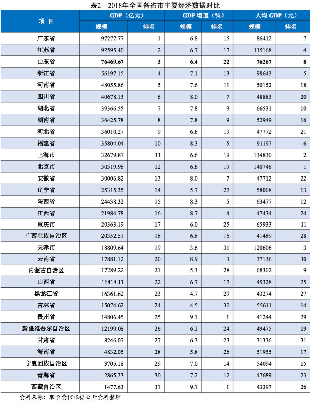 從山東省地級市GDP方面看,青島市的GDP規模和增速處于領先地位,2017-2018年,青島市GDP分別為11037.28億元和12001.50億元,GDP增速分別為7.5%和7.4%,2018年青島市GDP占全省的比重為15.69%。濟南市和煙臺市的GDP規模僅次于青島市,2018年,上述兩個地級市的GDP規模分別為7856.56億元和7232.58億元;濰坊市和淄博市的GDP規模均超過5000億元;GDP規模在5000~3000億元的地級市有濟寧市、臨沂市、東營市、泰安市、威海市、德州市、聊城市和菏澤市;日照市、濱州市、棗莊市和萊蕪市經濟實力較弱,GDP均不到3000億元。總體看,山東省各地級市經濟分化程度較高,青島市的GDP規模及增速處于絕對領先地位,濟南市、煙臺市、濰坊市和淄博市經濟體量其次,濱州市、棗莊市、日照市和萊蕪市經濟體量小。從人均GDP來看,2017年和2018年東營市、青島市和威海市的人均GDP處于省內最高,而聊城市、臨沂市和菏澤市規模最小,人均GDP差異主要為地方經濟實力及人口規模等因素所致。