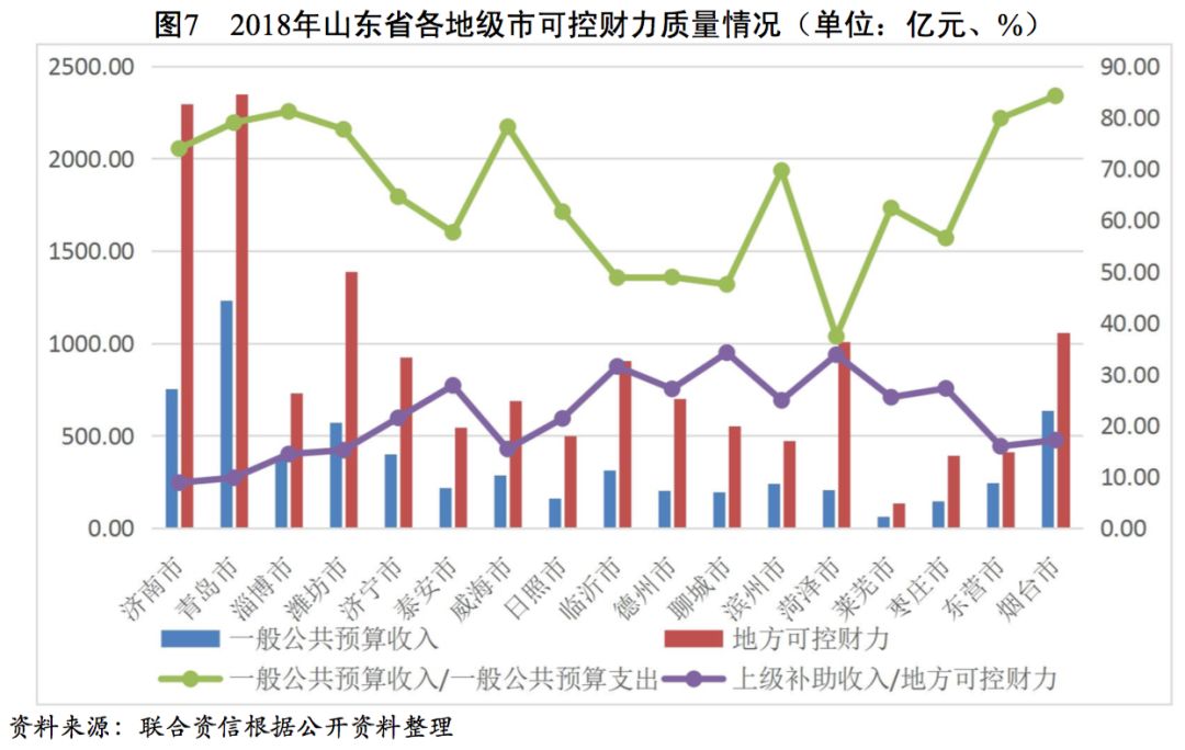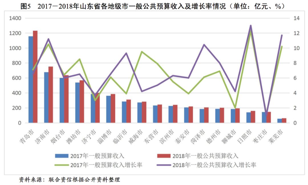 山東省經濟規模處于全國上游水平,2018年GDP排名全國第三,一般公共預算收入排名全國前列,政府債務率處于全國偏低水平,整體債務負擔輕。山東省各地級市經濟實力和財政收入分化較重,東部沿海城市和省會濟南市的經濟規模和財政實力明顯高于其他地級市。山東省各地級市一般公共預算收入質量較好,部分地級市政府債務負擔較重。