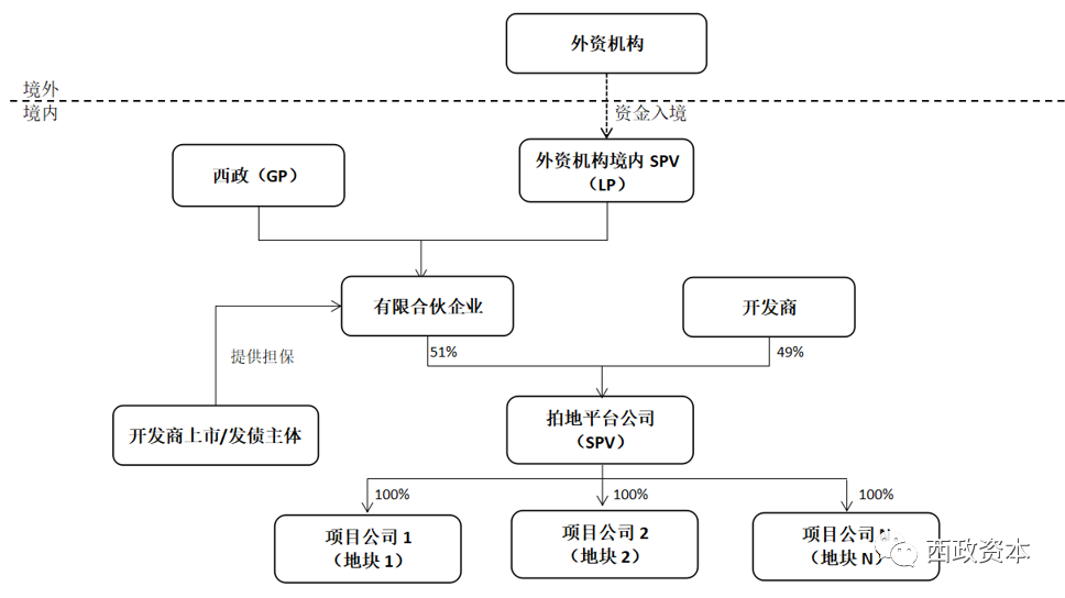 從當前的市面融資情況來看,2020年11月房企境內(nèi)外發(fā)債規(guī)模環(huán)比增長率超過了50%,部分中小房企境外發(fā)債利率突破了年化14%,另外2021年也將迎來還債高峰期。從房企的存量發(fā)債情況來看,目前總體上是借新還舊的多(尤其是境外發(fā)債)。從新增融資的路徑來看,房企2021年的增量融資主要得轉(zhuǎn)入兩個方向:第一個是真股融資或明股實債類融資,這是在“三道紅線”下房企表內(nèi)債壓降背景下的必然選擇;第二個權(quán)益類融資,比如房企的商業(yè)、辦公類物業(yè)所涉的資產(chǎn)收益權(quán)、租金收益權(quán)融資,房企的工程材料應(yīng)付賬款、購房尾款、物業(yè)管理應(yīng)收賬款等對應(yīng)的供應(yīng)鏈ABS或其他收益權(quán)類產(chǎn)品融資等。需要注意的是,目前上交所、深交所對于ABS產(chǎn)品的發(fā)行只允許存量發(fā)行,增量相對困難,但是保交所目前發(fā)行前述產(chǎn)品還存在增量的空間。此外,北金所的債權(quán)計劃對于發(fā)行主體不要求強制外部評級、資金用途和使用期限靈活、項目準入相對寬松、業(yè)務(wù)辦理流程簡單,目前已逐漸受到房企的青睞。除上述主流融資方式外,境外融資將成為不少房企更好的融資選擇,比如外資比較喜歡的土地競拍保證金資金池融資業(yè)務(wù),房企境外發(fā)行的364天的美元債,帶外資招商任務(wù)的土地款融資等(指山東、江蘇等地為代表的FDI類融資,具體可參見下述融資架構(gòu))。