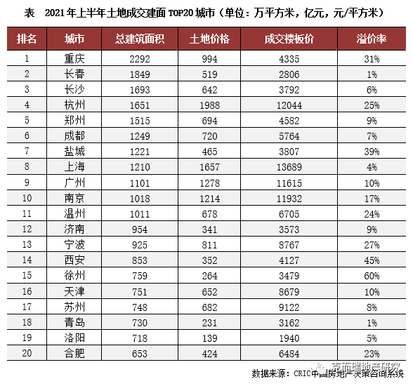 聯(lián)系市場熱度來看,長三角區(qū)域的土拍熱度明顯較高。徐州、鹽城、寧波、杭州、溫州、合肥等城市的溢價率在優(yōu)質(zhì)土地出讓的帶動下都超過了20%,其中徐州上半年平均成交溢價率更是高達60%,在成交量前20城市中溢價率排第一,其中銅山區(qū)土地單價紀錄更是在今年刷新,土拍熱度由此可見一斑。此外,西安、重慶等中西部城市在熱點區(qū)域優(yōu)質(zhì)土地大量入市的帶動下,溢價率均超30%,不過這些城市多是一些地價水平較低的城市,總的來看,市場熱度不及限價嚴苛的長三角區(qū)域。