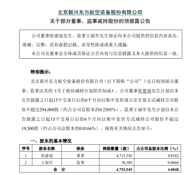在發布減持預告前,張建迪持股數量為4,715,356股,占公司總股本比例為4.0182%;王福軍持股數量為78,189股,占公司總股本比例為0.0666%。