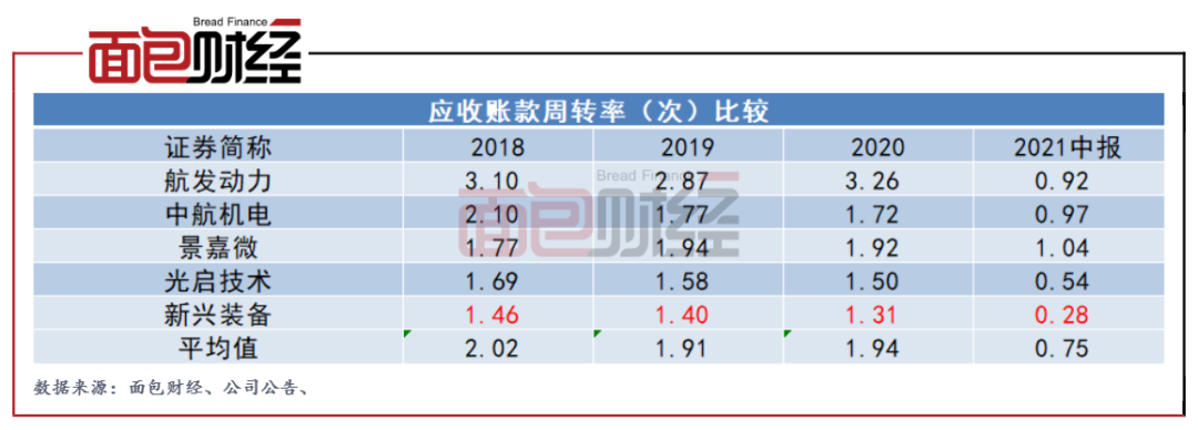 與同行業其他公司相比,近年來,新興裝備的應收賬款周轉率均低于同行業其他上市公司。從平均值來看,截止6月末,航發動力、中航機電等5家公司應收賬款周轉率平均值為0.75. 新興裝備的應收賬款周轉率低于行業平均值0.47次。