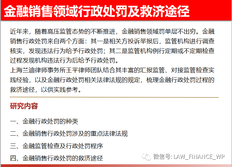近年來,隨著高壓監(jiān)管態(tài)勢的不斷推進,金融銷售領(lǐng)域罰單層不出窮。金融銷售行政處罰來自兩個方面:其一是相關(guān)方投訴舉報后,監(jiān)管機構(gòu)進行調(diào)查核實,發(fā)現(xiàn)違法行為給予行政處罰;其二是監(jiān)管機構(gòu)例行定期或不定期檢查過程發(fā)現(xiàn)機構(gòu)違法行為后給予行政處罰。行政處罰的救濟途徑包括檢查期間溝通、聽證程序、行政復議及行政訴訟,每個階段有各種特點,進而也有對應的溝通技巧。本次研究報告的內(nèi)容如下:
