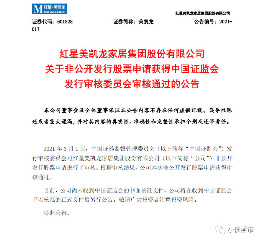 3月1日,紅星美凱龍(601828.SH,01528.HK)公告稱(chēng),中國(guó)證監(jiān)會(huì)發(fā)行審核委員會(huì)對(duì)其非公開(kāi)發(fā)行股票申請(qǐng)進(jìn)行了審核。根據(jù)審核結(jié)果,公司本次非公開(kāi)發(fā)行股票申請(qǐng)獲得審核通過(guò)。