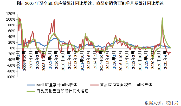 其二,貨幣過度超發,但對房地產行業拉動力依次遞減。2000-2021年,M1供應量由5.3萬億元躍升至64.7萬億元,凈增長11.2倍,成為房地產行業規模持續上行的重要因素。但由于貨幣政策刺激的遞減效應,其對房地產行業拉動力大幅減弱。例如2009年四季度,M1供應量累計同比增速達到30%以上,商品房銷售面積單月同比增速則達到70%以上。反觀2020年四季度,M1供應量累計同比增速保持在10%附近,商品房銷售面積單月同比增速則回落至15%以內。