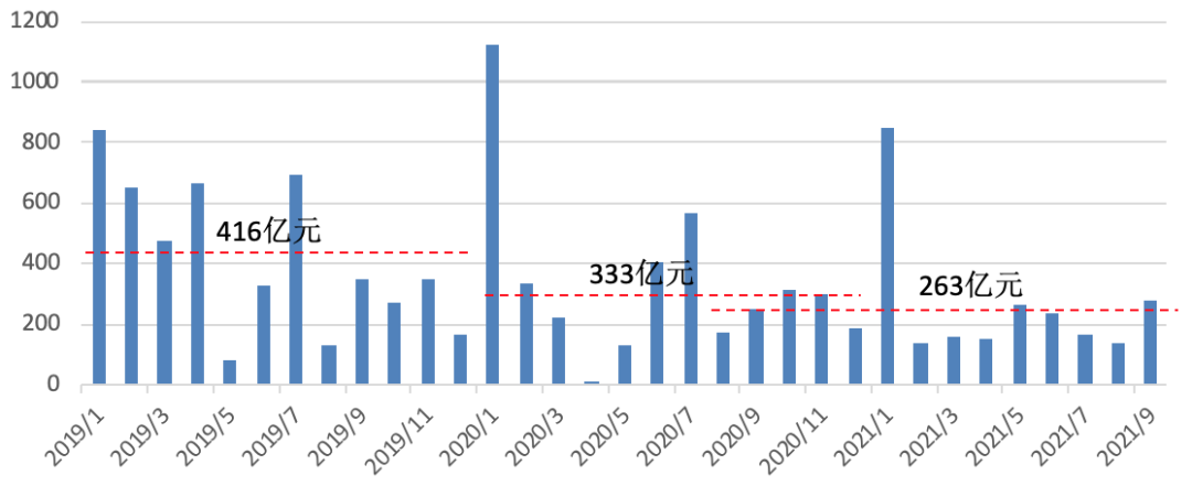 圖:100家典型房企2019-2021年9月單月境外發債情況(單位:億元)