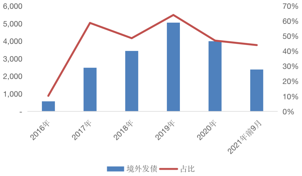 圖:100家典型房企2016-2021年9月境外發債及占比情況(單位:億元)