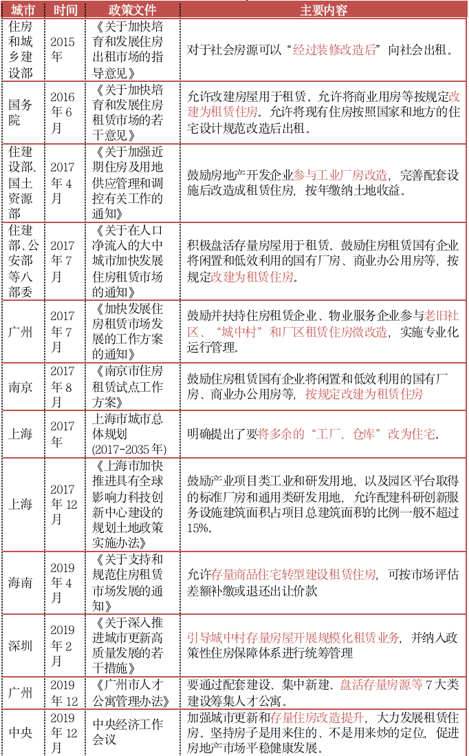 在中央的引領下,多個試點城市如上海、深圳、南京等發布方案細則,推動“工改租”、“商改租”、“非改居”等改造模式,進而促進存量資產與租住需求的有效對接,整合資源,緩解城市住房矛盾。