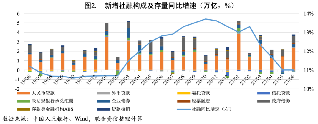 2021年上半年,社融存量同比增速整體呈下行趨勢。截至6月末,社會融資規模存量達到301.56萬億元,同比增速較上年末下降2.30個百分點至11.00%。上半年新增社融17.74萬億元,雖同比少增3.09萬億元,但卻是僅次于上年的歷史同期較高值,反映出上半年實體經濟融資需求較為旺盛。