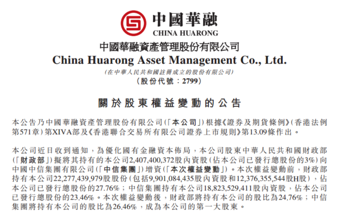 三個月后,華融第一大股東財政部將其持有的公司約24.07億股向中信集團增資,中信集團持股比例增至26.46%成為第一大股東,財政部直接持股則降為24.76%。