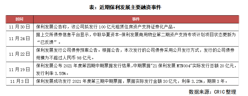 2021年11月融資環境回暖,央企、地方國企成為了先發債對象。其中保利發展11月成功發行兩筆中期票據,合計規模為50億元。而臨近11月末,保利發展先后公告了兩筆融資方案,擬發行98億元公司債,以及100億元規模的租賃住房資產支持證券化產品。僅僅11月,保利發展已發行及注冊擬發行的融資規模就已達到248億。在頻繁融資之后,保利12月在第三輪土拍上頻頻出手,尤其是廣州第三批集中供地投資近百億。
