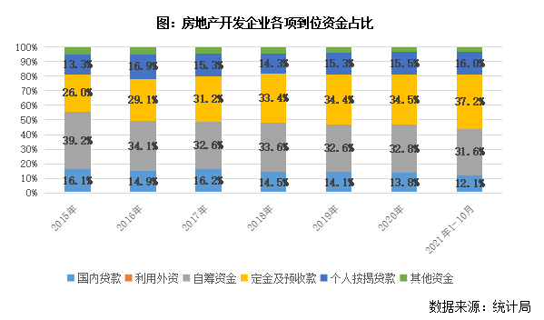 據(jù)統(tǒng)計局數(shù)據(jù)顯示,2021年1-10月,房地產(chǎn)開發(fā)企業(yè)到位資金16.7萬億元,同比增長8.8%。其中,國內(nèi)貸款2萬億元,同比下降10%,占比跌至12.1%,較2020年末減少1.7個百分點。自籌資金5.3萬億元,同比增長5.1%,占比跌至31.6%,較2020年末減少1.2個百分點。定金及預(yù)收款6.2萬億元,同比增長21%,占比升至37.2%,較2020年末增加2.8個百分點。個人按揭貸款2.7萬億元,同比增長9.7%,占比升至16%,較2020年末增加0.5個百分點。說明國內(nèi)貸款、自籌資金增長顯著受限,定金及預(yù)收款、個人按揭貸款漸成房企最為重要的資金渠道來源,企業(yè)對銷售回款的依賴度持續(xù)提升。