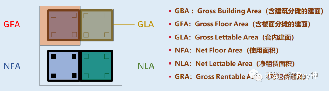 在之前的文章中,我們提到過不動(dòng)產(chǎn)的面積類型包括:建筑面積(GFA或GBA)、套內(nèi)面積(GLA)、使用面積(NFA)等等。這幾種面積類型其實(shí)都是從空間的物理維度進(jìn)行衡量的,即:空間在圖紙上或?qū)嶓w建筑上客觀存在著的面積。這幾種面積通常會(huì)體現(xiàn)在我們的產(chǎn)權(quán)證上,因此通常也可以認(rèn)為是產(chǎn)權(quán)口徑的數(shù)據(jù)。一般我們進(jìn)行面積測(cè)量,首先要搞清楚的就是這幾個(gè)口徑的面積。特別是,當(dāng)項(xiàng)目沒有將產(chǎn)權(quán)切分到房間的時(shí)候,那業(yè)主方就更需要自己去理清楚它們之間的關(guān)系。