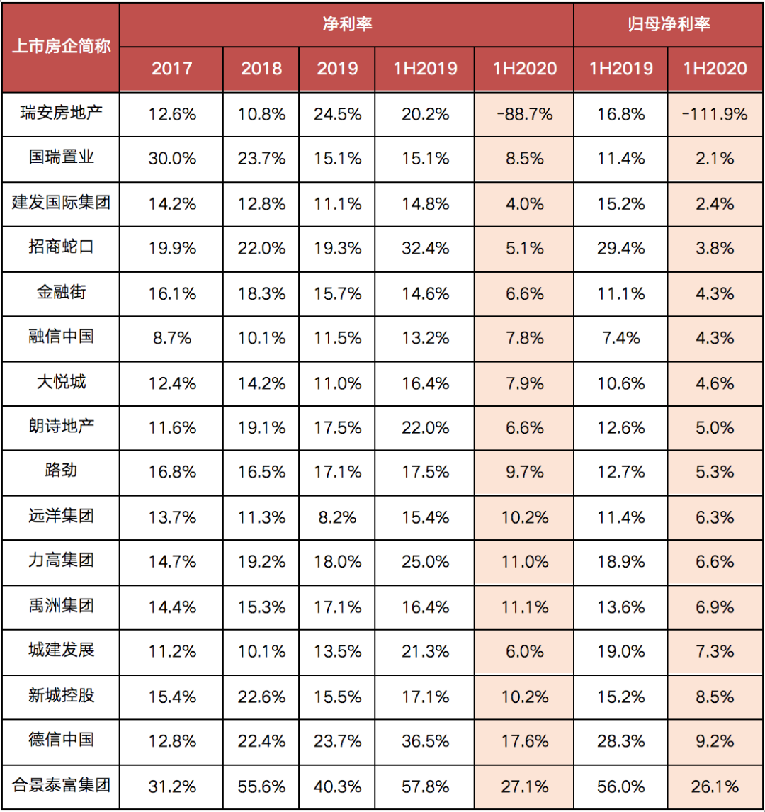 2020年上半年,房地產市場走出深V型曲線,受疫情影響,今年市場銷售節奏整體后移,房企項目竣工及交付結轉進度普遍延緩,收入無法如期確認,營業收入增速較去年同期進一步明顯放緩。從利潤率指標來看,2020年上半年房企整體的毛利率、凈利率及歸母凈利率水平均延續近年來的下行趨勢,且降幅進一步擴大。