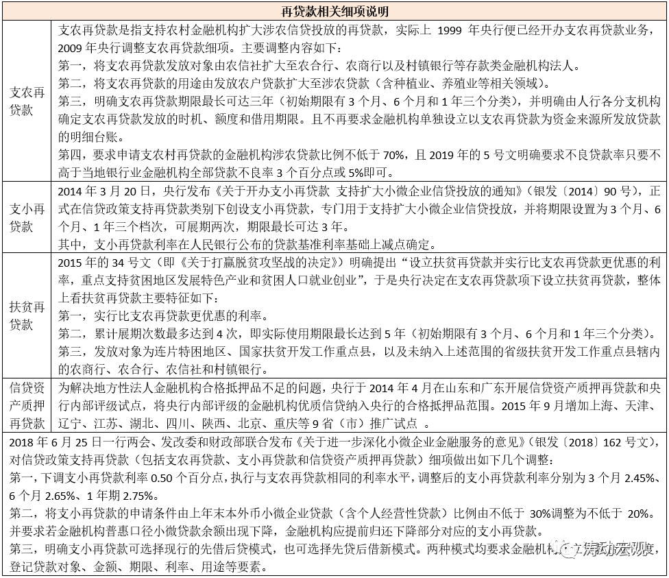 (4)MLF(Medium-term Lending Facility,簡稱中期借貸便利,亦特麻辣粉)與TMLF(Targeted Medium-term Lending Facility,簡稱定向中期借貸便利,亦稱特麻辣粉)均主要面向“三農”、小微和民營企業貸款(新增),期限為3個月、6個月、1年(居多)。具體看,2014年9月與2018年12月,央行分別創設MLF和TMLF,從最初創設的目的來看,前者以支持小微企業和債轉股為主,后者則用以定向支持金融機構向小微企業和民營企業發放貸款。